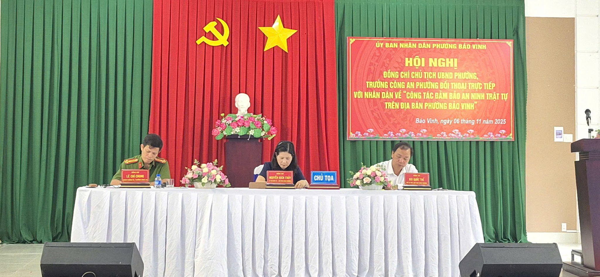 Đồng chí Nguyễn Bích Thủy - Bí thư Đảng ủy, Chủ tịch HĐND phường; đồng chí Bùi Quốc Thể - Phó Bí thư Đảng ủy, Chủ tịch UBND phường và đồng chí Lê Chí Chung - Ủy viên Ban Thường vụ Đảng ủy, Trưởng Công an phường đồng chủ trị hội nghị.