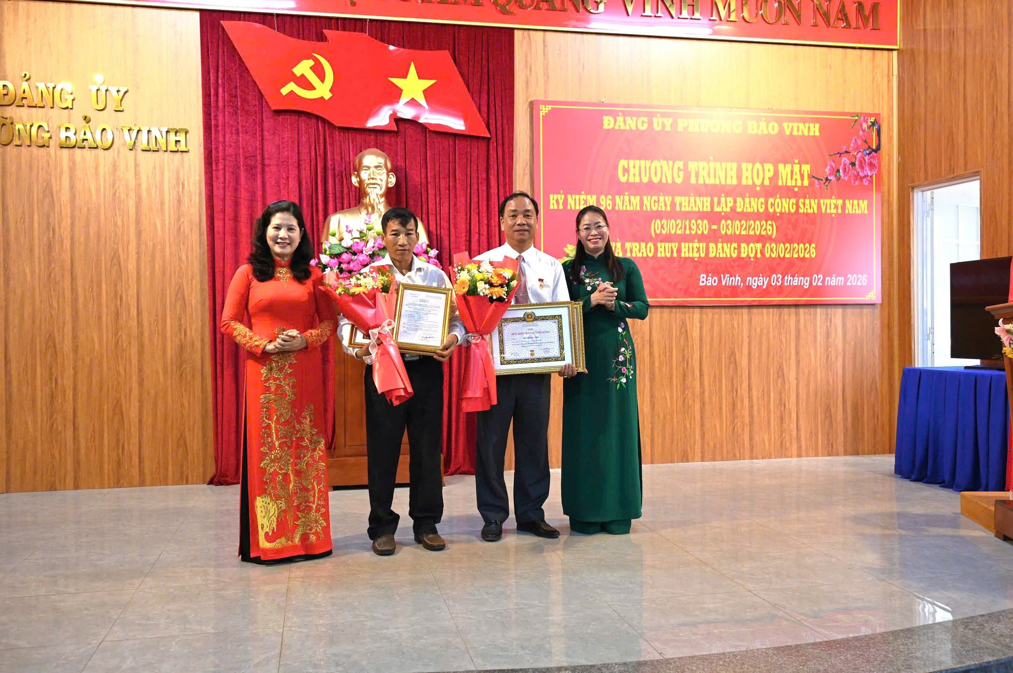 Cũng tại chương trình họp mặt, Ban Thường vụ Đảng ủy phường trao Quyết định của Ban Thường vụ Tỉnh ủy về tặng Huy hiệu 30 năm tuổi Đảng cho đồng chí Bùi Quốc Thể, Chủ tịch UBND phường, đảng viên Chi bộ Văn phòng HĐND và UBND phường và đồng chí Nguyễn Văn Chinh, đảng viên Chi bộ khu phố Ruộng Tre. Trao giấy khen hoàn thành xuất sắc nhiệm vụ 05 năm liền (2021-2025) của Ban Thường vụ Đảng ủy phường cho đồng chí Nguyễn Thị Anh, đảng viên Chi bộ trường Tiểu học Nguyễn Huệ.