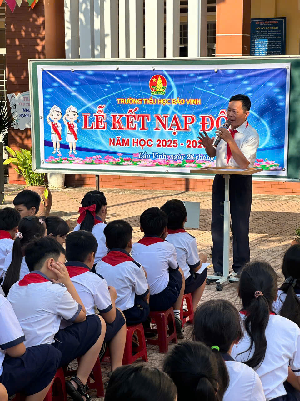 Tại buổi lễ, các em đội viên mới đã được đeo khăn quàng đỏ – biểu tượng thiêng liêng của tuổi thơ Việt Nam và cùng nhau tuyên thệ thực hiện tốt 5 điều Bác Hồ dạy, thể hiện quyết tâm học tập, rèn luyện để trở thành con ngoan, trò giỏi, đội viên tốt