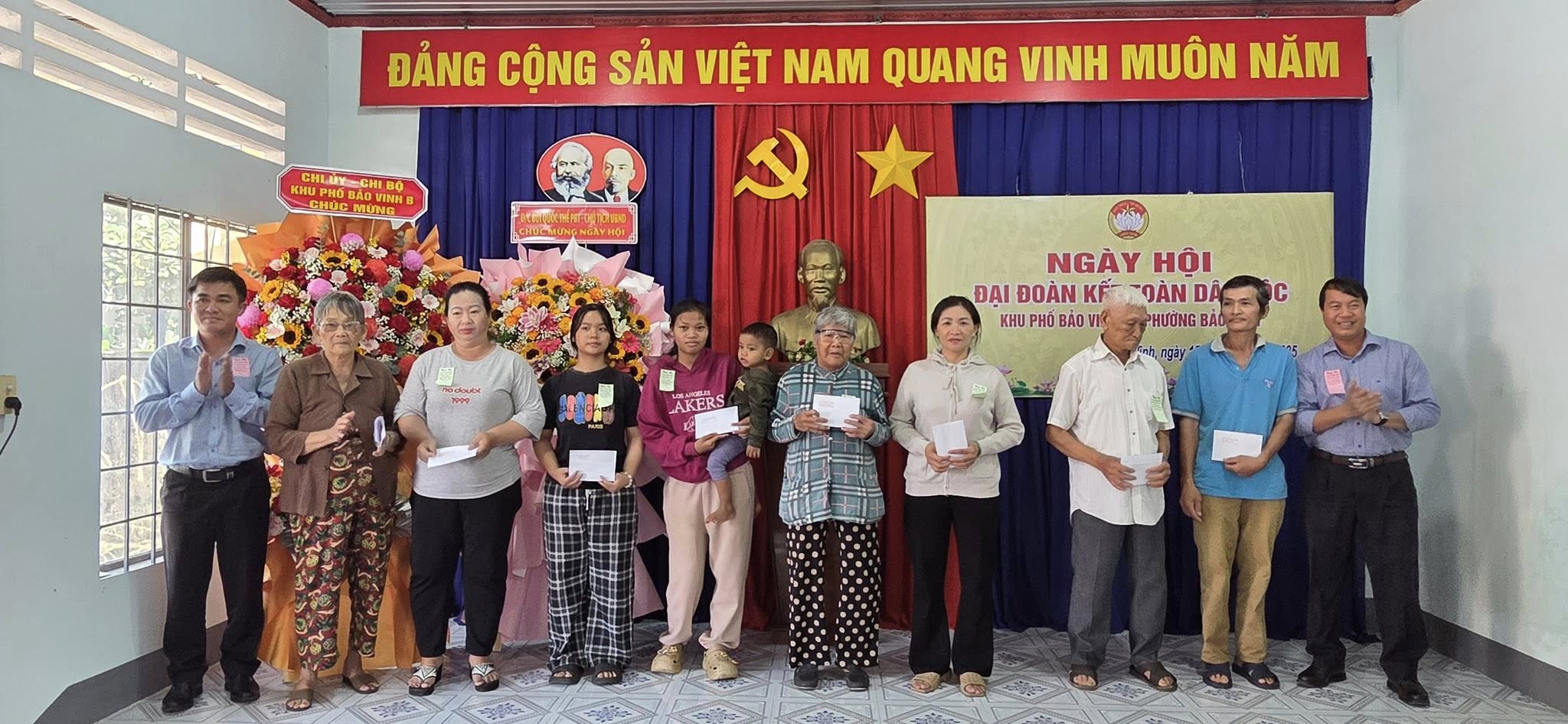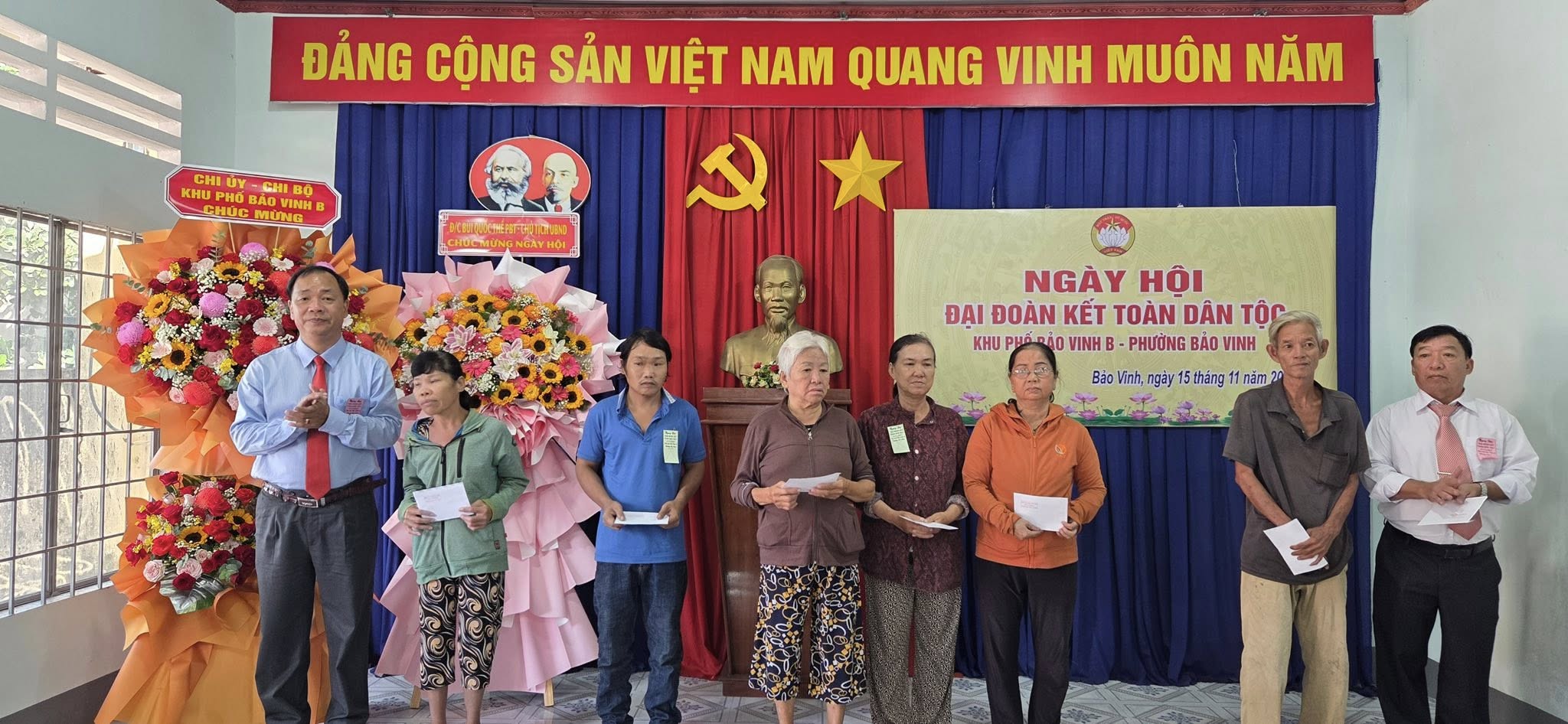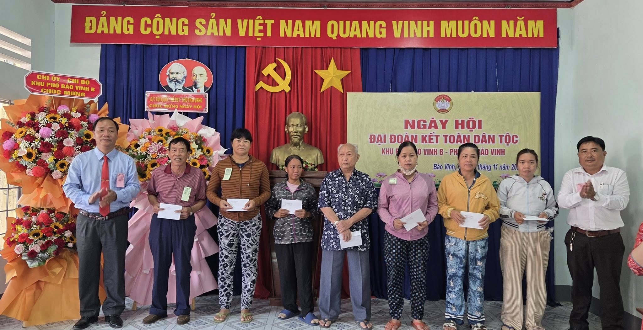 Dự có đồng chí Bùi Quốc Thể – Phó Bí Thư Đảng ủy - Chủ tịch UBND phường Bảo Vinh; đồng chí Trần Văn Việt – Phó chủ tịch Thường trực UBMTTQVN – Chủ tịch Hội Nông dân phường Bảo Vinh; Các đồng chí trong Ban vận động “ Toàn dân đoàn kết xây dựng đời sống văn hoá” khu phố Bảo Vinh B, đảng viên, các mạnh thường quân và bà con Nhân dân trên địa bàn khu phố tham dự.