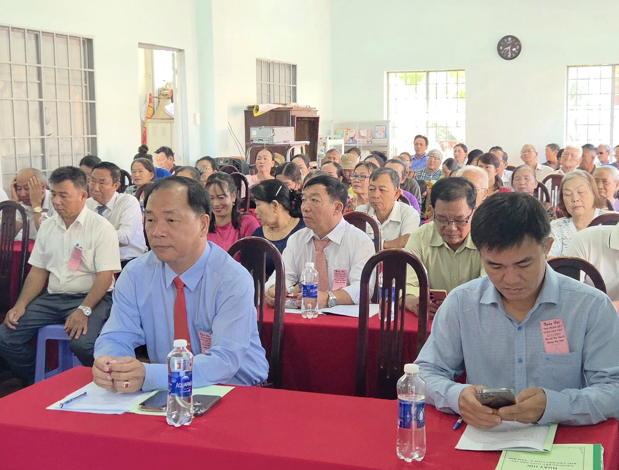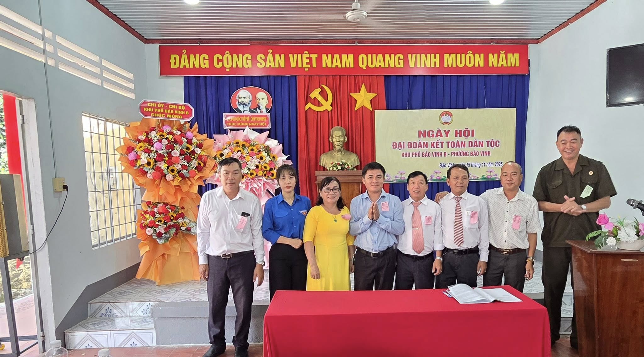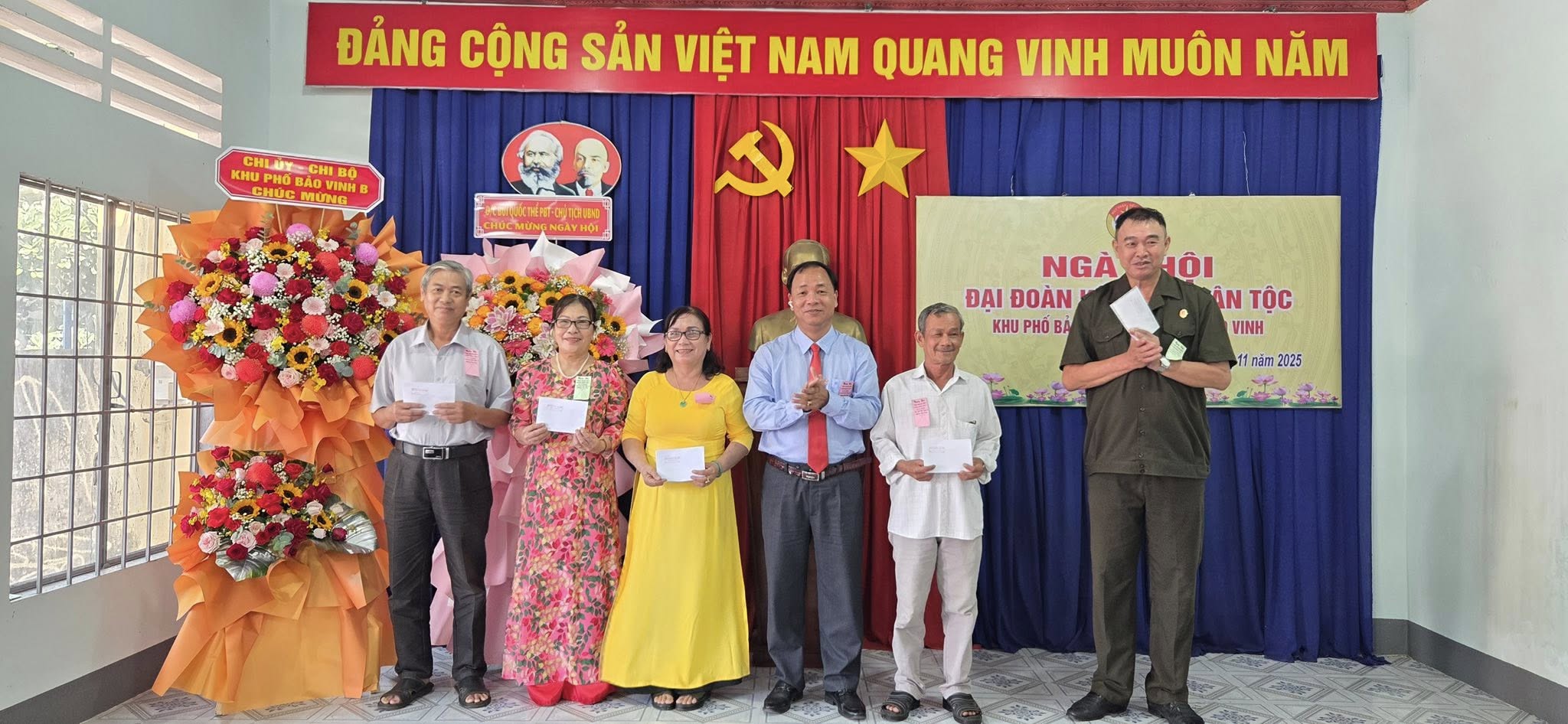 Dự có đồng chí Bùi Quốc Thể – Phó Bí Thư Đảng ủy - Chủ tịch UBND phường Bảo Vinh; đồng chí Trần Văn Việt – Phó chủ tịch Thường trực UBMTTQVN – Chủ tịch Hội Nông dân phường Bảo Vinh; Các đồng chí trong Ban vận động “ Toàn dân đoàn kết xây dựng đời sống văn hoá” khu phố Bảo Vinh B, đảng viên, các mạnh thường quân và bà con Nhân dân trên địa bàn khu phố tham dự.