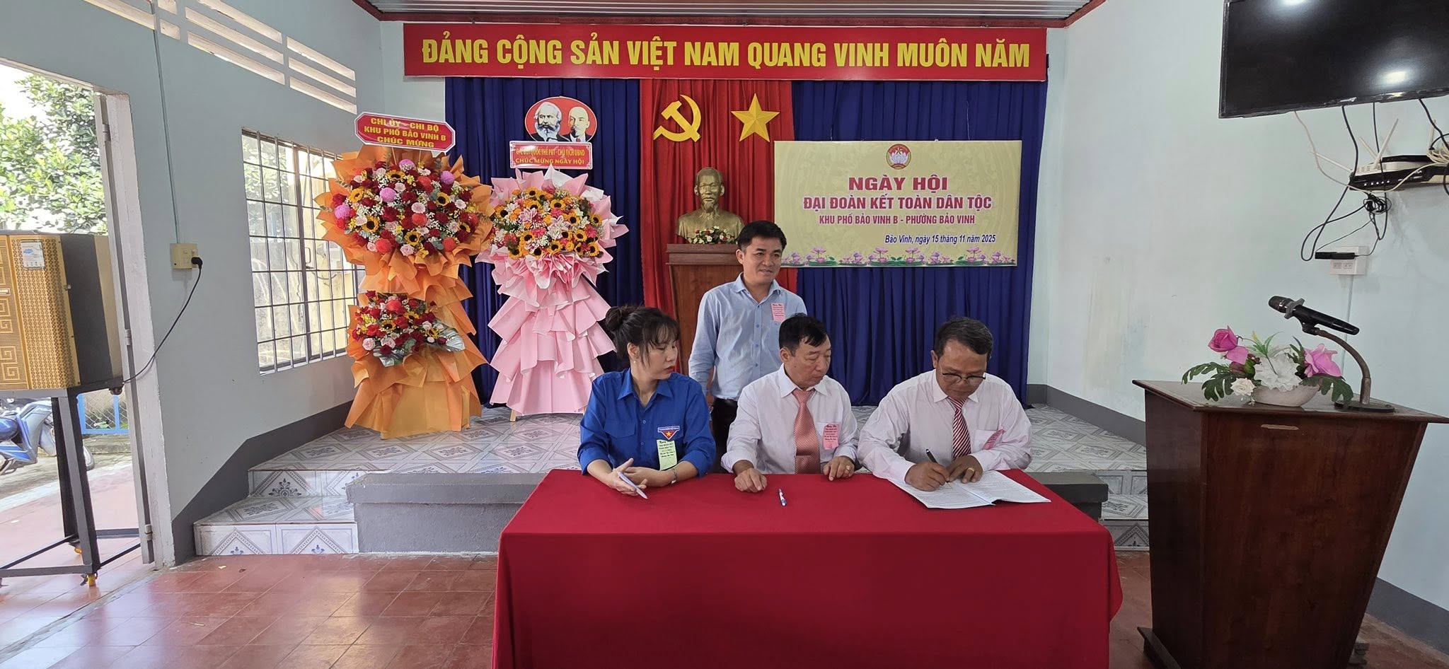 Tại phần lễ, các đại biểu cùng nhau ôn lại truyền thống 95 năm Ngày thành lập Mặt trận Dân tộc thống nhất Việt Nam - Ngày Truyền thống Mặt trận Tổ quốc Việt Nam ( 18/11/1930 – 18/11/2025). Nghe trưởng Ban vận động “ Toàn dân đoàn kết xây dựng đời sống văn hoá” khu phố báo cáo kết quả thực hiện phong trào “ Toàn dân đoàn kết xây dựng đời sống văn hoá” khu phố Bảo Vinh B năm 2025 và phương hướng nhiệm vụ năm 2026. Đồng thời thực hiện phát động và ký kết phong trào thi đua chào mừng Đại hội Đảng toàn quốc lần thứ XIV, nhiệm kỳ 2026-2031 và Đại hội đại biểu toàn quốc Mặt trận Tổ quốc Việt Nam lần thứ XI, nhiệm kỳ 2026-2031