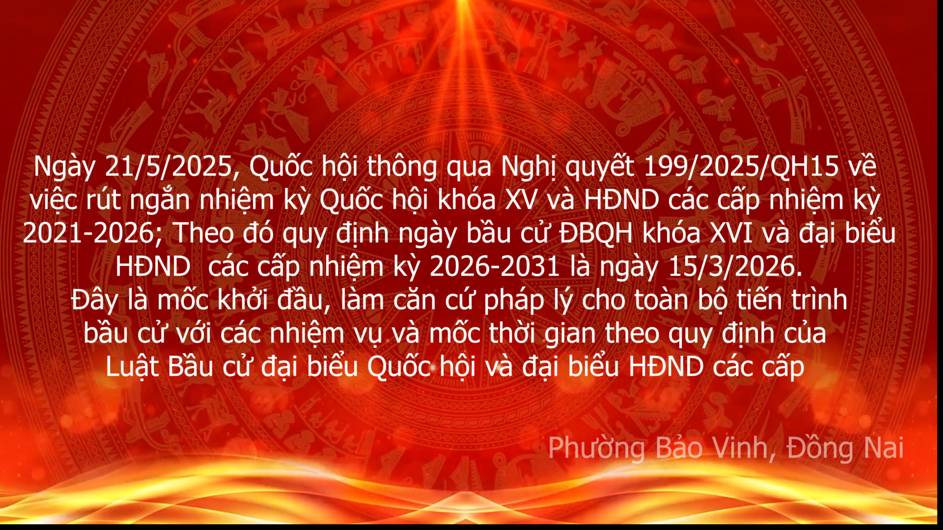 Ngày 21/5/2025, Quốc hội thông qua Nghị quyết số 199/2025/QH15 về việc rút ngắn nhiệm kỳ Quốc hội khoá XV và Hội đồng nhân dân các cấp nhiệm kỳ 2021 2026; ngày bầu cử đại biểu Quốc hội khóa XVI và đại biểu Hội đồng nhân dân các cấp nhiệm kỳ 2026 - 2031. Theo đó quy định ngày bầu cử ĐBQH khóa XVI và đại biểu HĐND các cấp nhiệm kỳ 2026 - 2031 là ngày 15/3/2026. Đây là mốc khởi đầu, làm căn cứ pháp lý cho toàn bộ tiến trình bầu cử với các nhiệm vụ và mốc thời gian theo quy định của Luật Bầu cử đại biểu Quốc hội và đại biểu Hội đồng Nhân dân