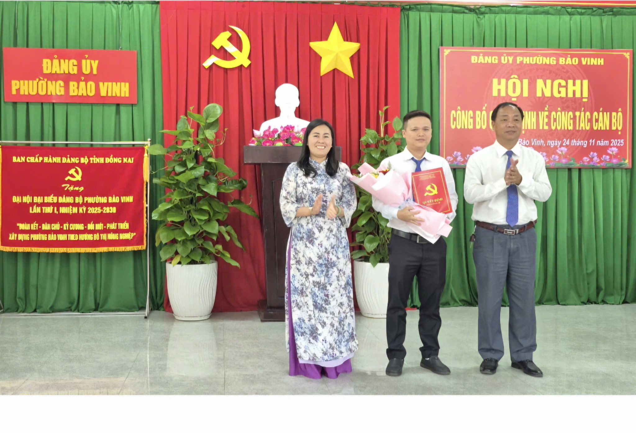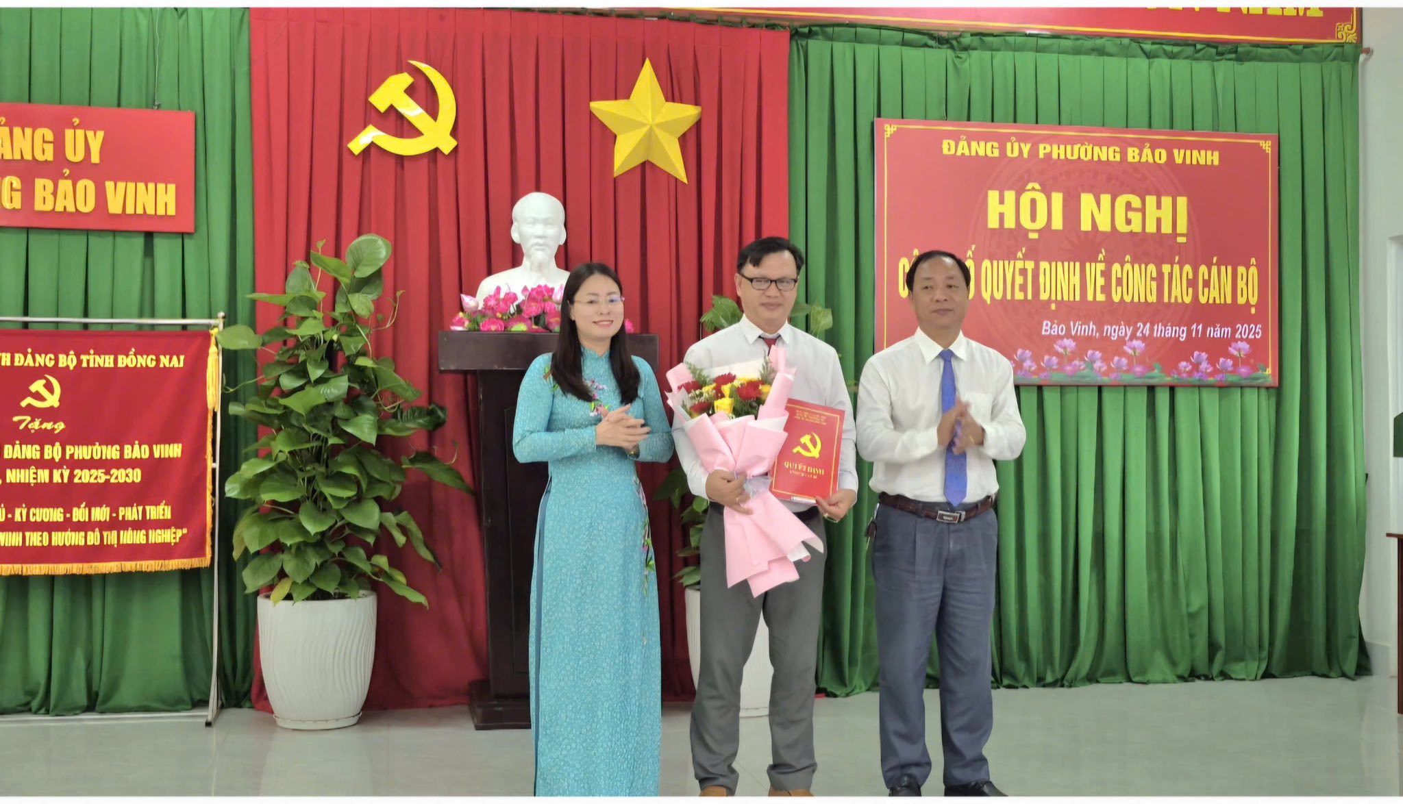 Tiếp đó tại hội nghị, UBND phường đã công bố các quyết định bổ nhiệm đối với đồng chí Trần Văn Kim giữ chức vụ Trưởng phòng Văn hóa-Xã hội phường Bảo Vinh; đồng chí Lê Thanh Hiếu, Phó Trưởng ban Kinh tế- Ngân sách HĐND phường Bảo Vinh giữ chức vụ Giám đốc Trung tâm Dịch vụ tổng hợp phường; thời hạn bổ nhiệm là 05 năm kể từ ngày 20/11/2025. Tiếp nhận ông Tạ Xuân Sơn, Đảng ủy viên, Chánh văn phòng Đảng ủy phường đến nhận công tác làm chuyên viên Văn phòng HĐND-UBND phường.