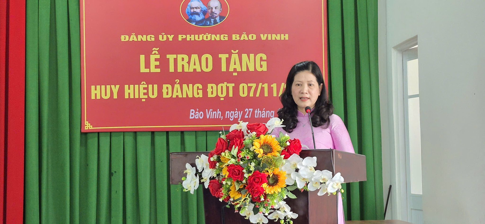 Phát biểu tại buổi Lễ, đồng chí Nguyễn Bích Thủy – Bí thư Đảng ủy, Chủ tịch HĐND phường trân trọng ghi nhận những đóng góp của các đồng chí đảng viên nói chung và đồng chí được nhận Huy hiệu Đảng nói riêng trong thời gian qua. Đồng chí Bí thư Đảng ủy phường mong muốn các đảng viên tiếp tục cống hiến sức lực, trí tuệ, nêu cao vai trò trách nhiệm của người đảng viên, phát huy phẩm chất đạo đức cách mạng, tinh thần tiên phong gương mẫu tích cực đóng góp trí tuệ và tâm huyết xây dựng Đảng bộ phường Bảo Vinh trong sạch, vững mạnh; đồng hành cùng Ban chấp hành Đảng bộ phường thực hiện thắng lợi các mục tiêu, nhiệm vụ Nghị quyết Đại hội phường Bảo Vinh lần thứ I, nhiệm kỳ 2025-2030, sớm hoàn thành mục tiêu xây dựng phường Bảo Vinh trở thành đô thị nông nghiệp.
