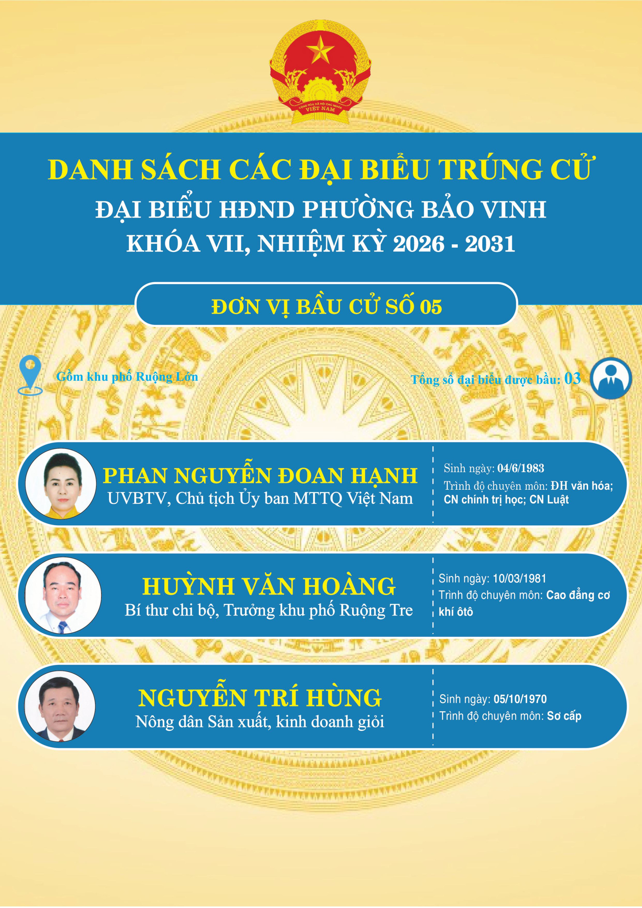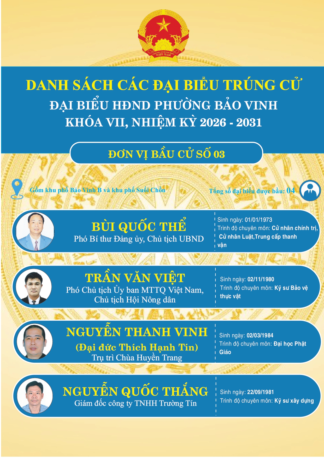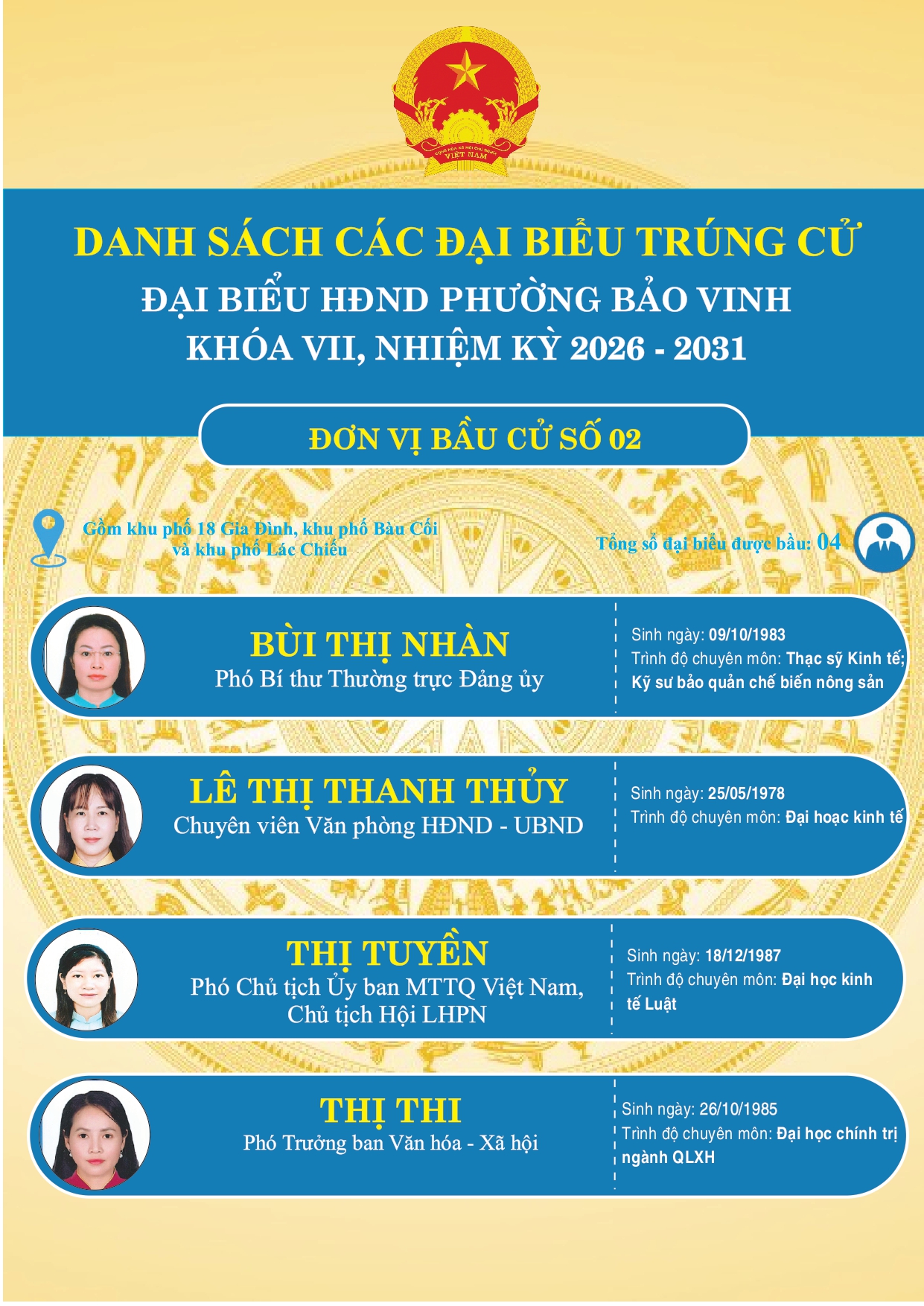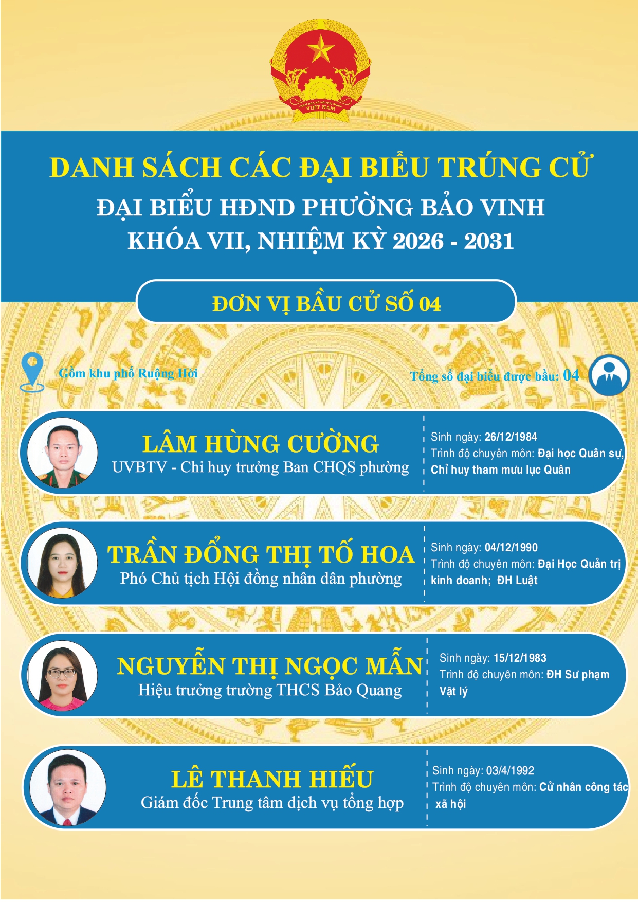 CÔNG BỐ DANH SÁCH CÁC ĐẠI BIỂU TRÚNG CỬ ĐẠI BIỂU HĐND &nbsp;PHƯỜNG BẢO VINH KHOÁ VII, NHIỆM KỲ 2026-2031