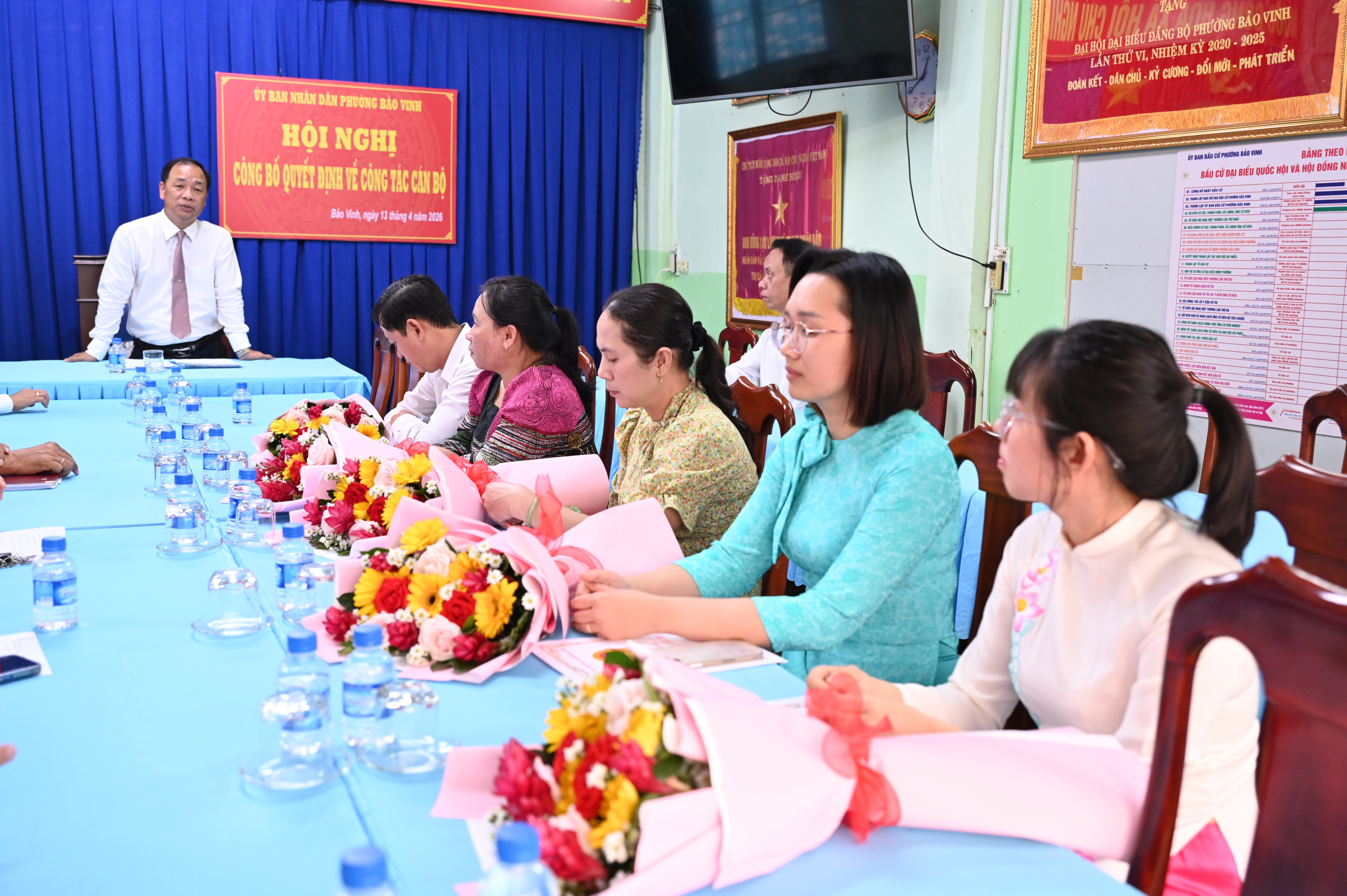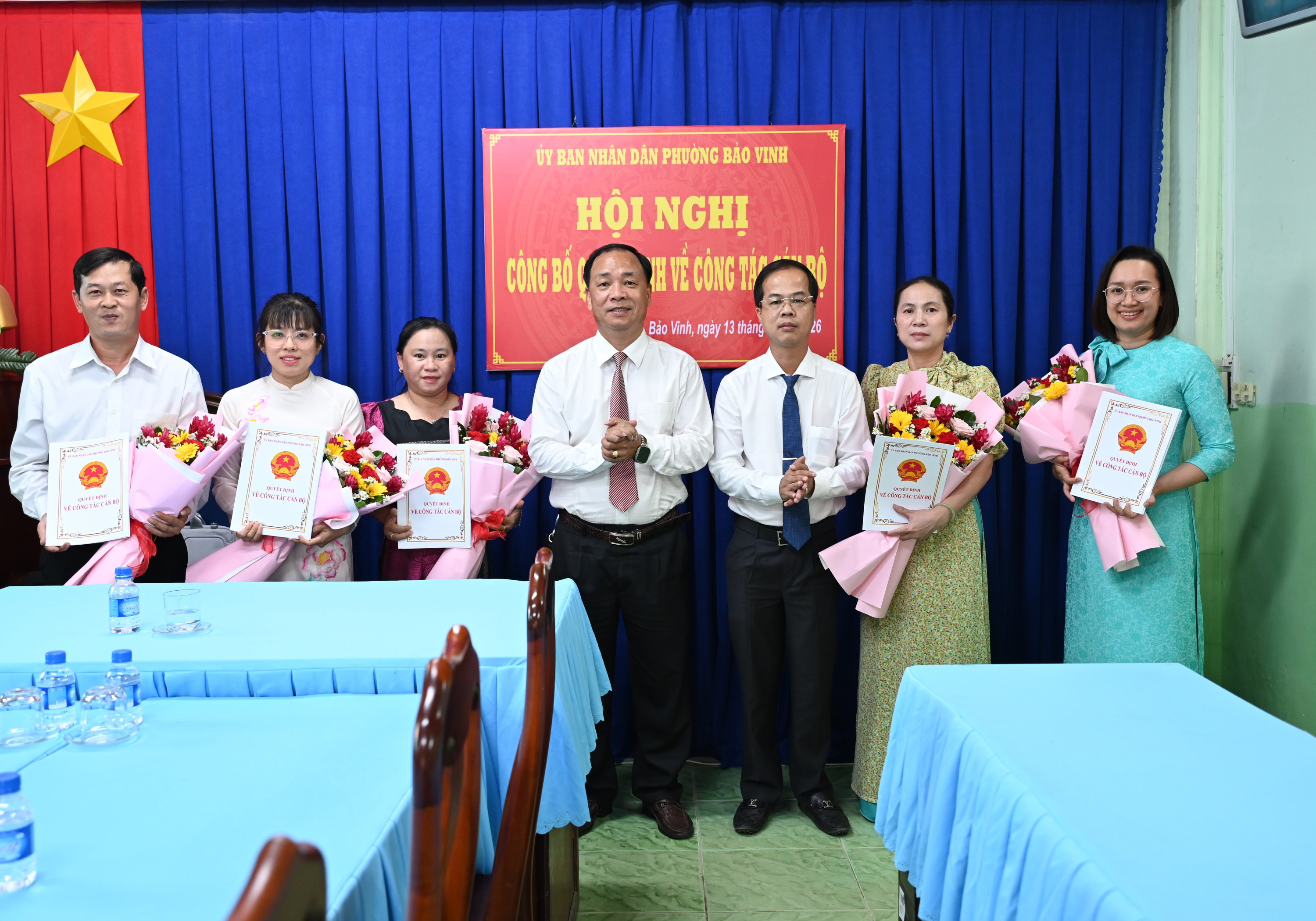 Chiều ngày 13/4/2026, UBND phường Bảo Vinh tổ chức Hội nghị công bố quyết định tiếp nhận và bố trí công tác đối với các công chức. Tham dự và chủ trì hội nghị có đồng chí Bùi Quốc Thể – Phó Bí thư Đảng ủy, Chủ tịch UBND phường; cùng dự có đồng chí Hồ Phạm Trường Sơn – Ủy viên Ban Thường vụ, Phó Chủ tịch UBND phường, lãnh đạo các bộ phận chuyên môn và 05 công chức được tiếp nhận, phân công nhiệm vụ.