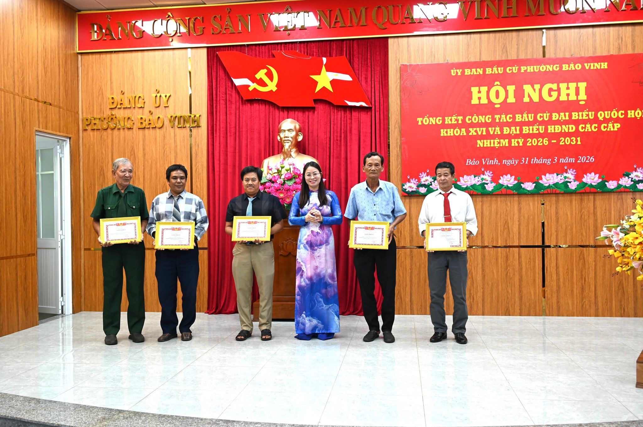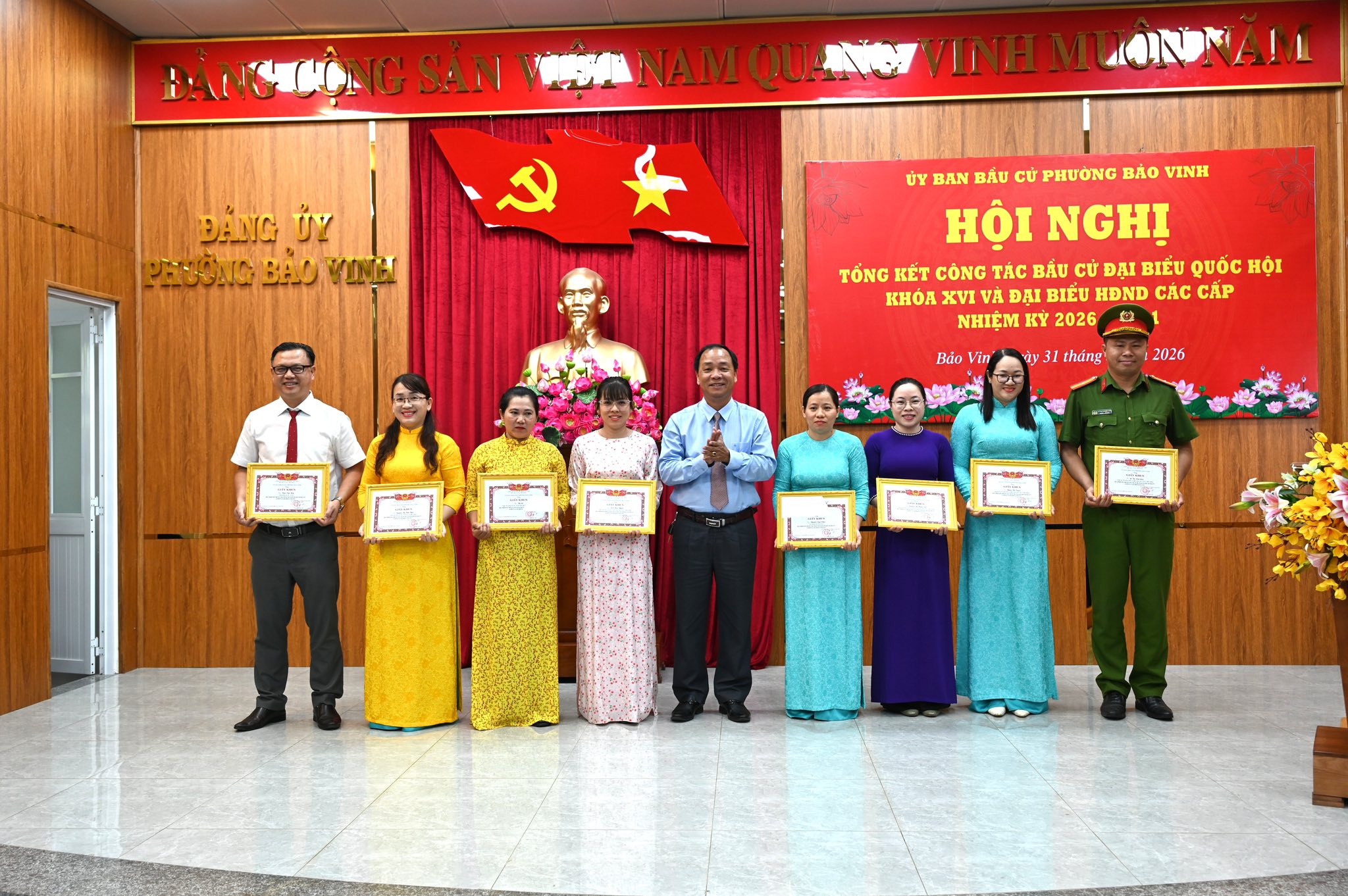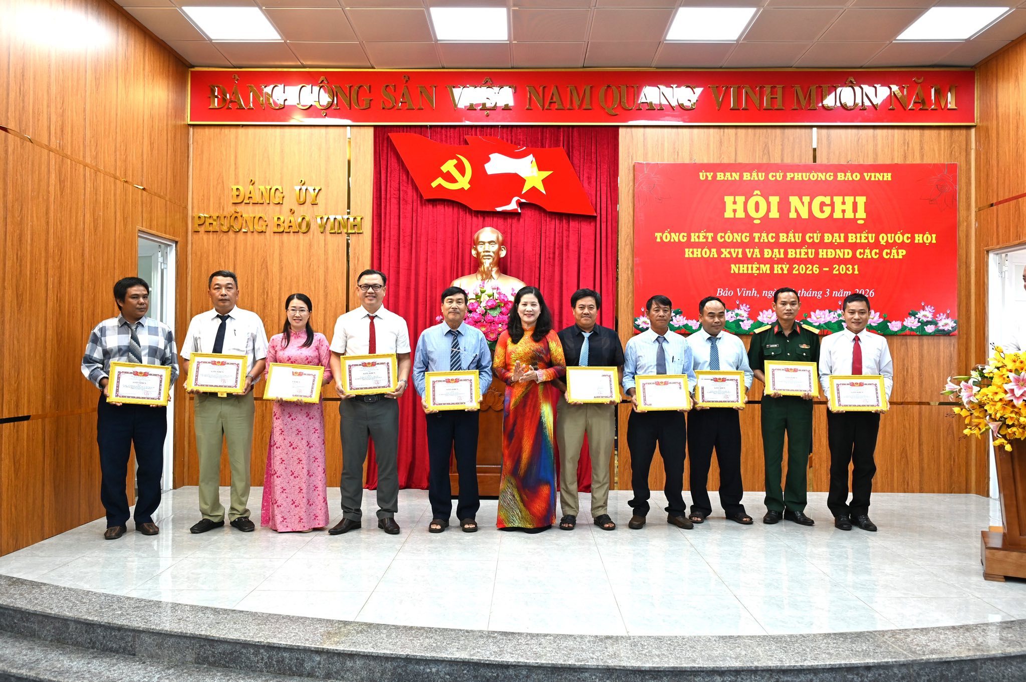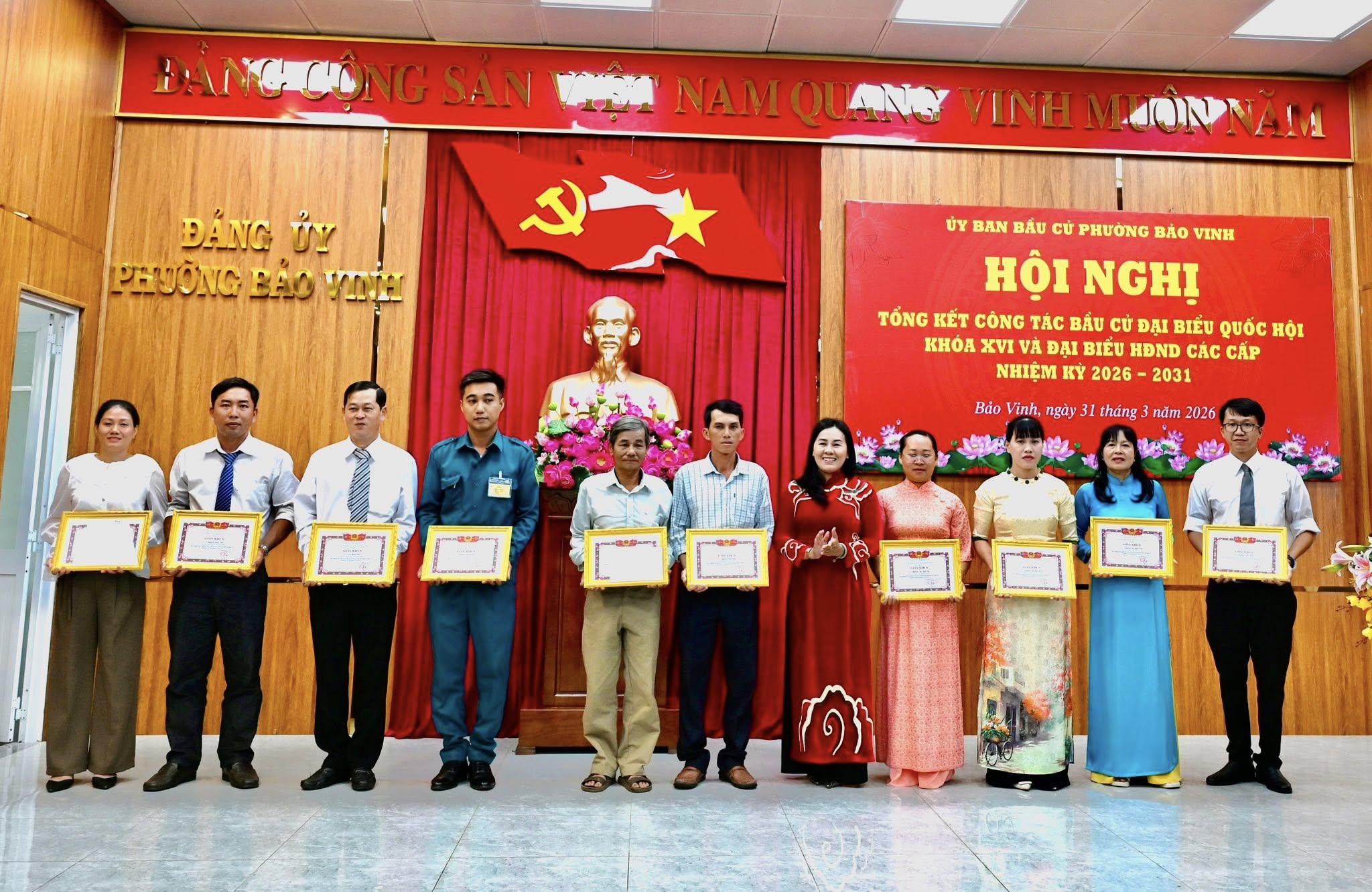 Sáng ngày 31/3/2026, Ủy ban bầu cử phường Bảo Vinh tổ chức Hội nghị tổng kết công tác bầu cử đại biểu Quốc hội khóa XVI và đại biểu HĐND các cấp nhiệm kỳ 2026 – 2031; biểu dương, khen thưởng các tập thể, cá nhân có thành tích xuất sắc.