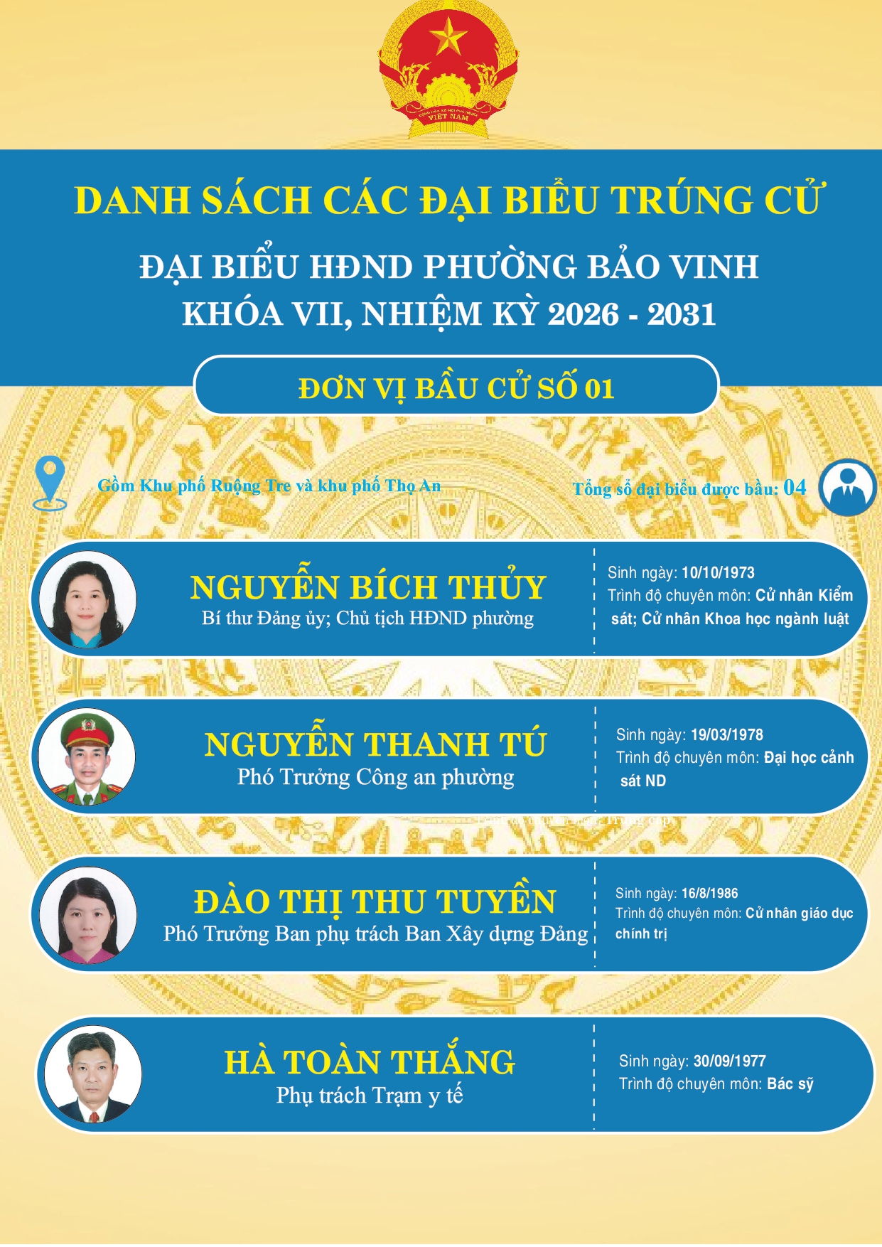 CÔNG BỐ DANH SÁCH CÁC ĐẠI BIỂU TRÚNG CỬ ĐẠI BIỂU HĐND PHƯỜNG BẢO VINH KHOÁ VII, NHIỆM KỲ 2026-2031