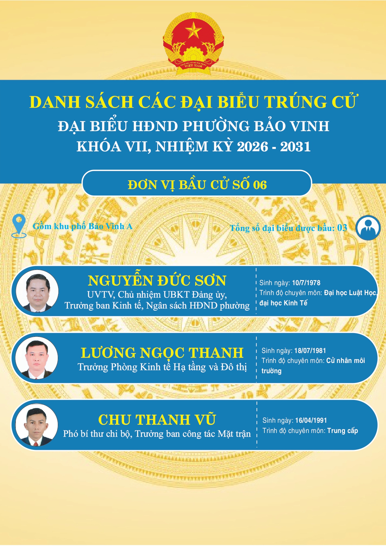 DANH SÁCH CÁC ĐẠI BIỂU TRÚNG CỬ ĐẠI BIỂU HĐND PHƯỜNG BẢO VINH KHOÁ VII, NHIỆM KỲ 2026-2031