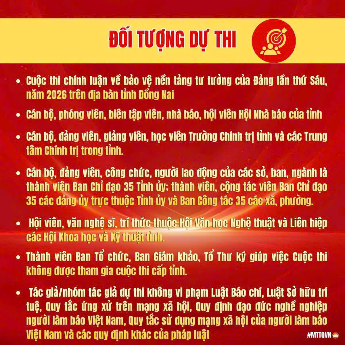 Đồng Nai phát động Cuộc thi chính luận về bảo vệ nền tảng tư tưởng của Đảng lần thứ Sáu, năm 2026 trên địa bàn tỉnh Đồng Nai.
