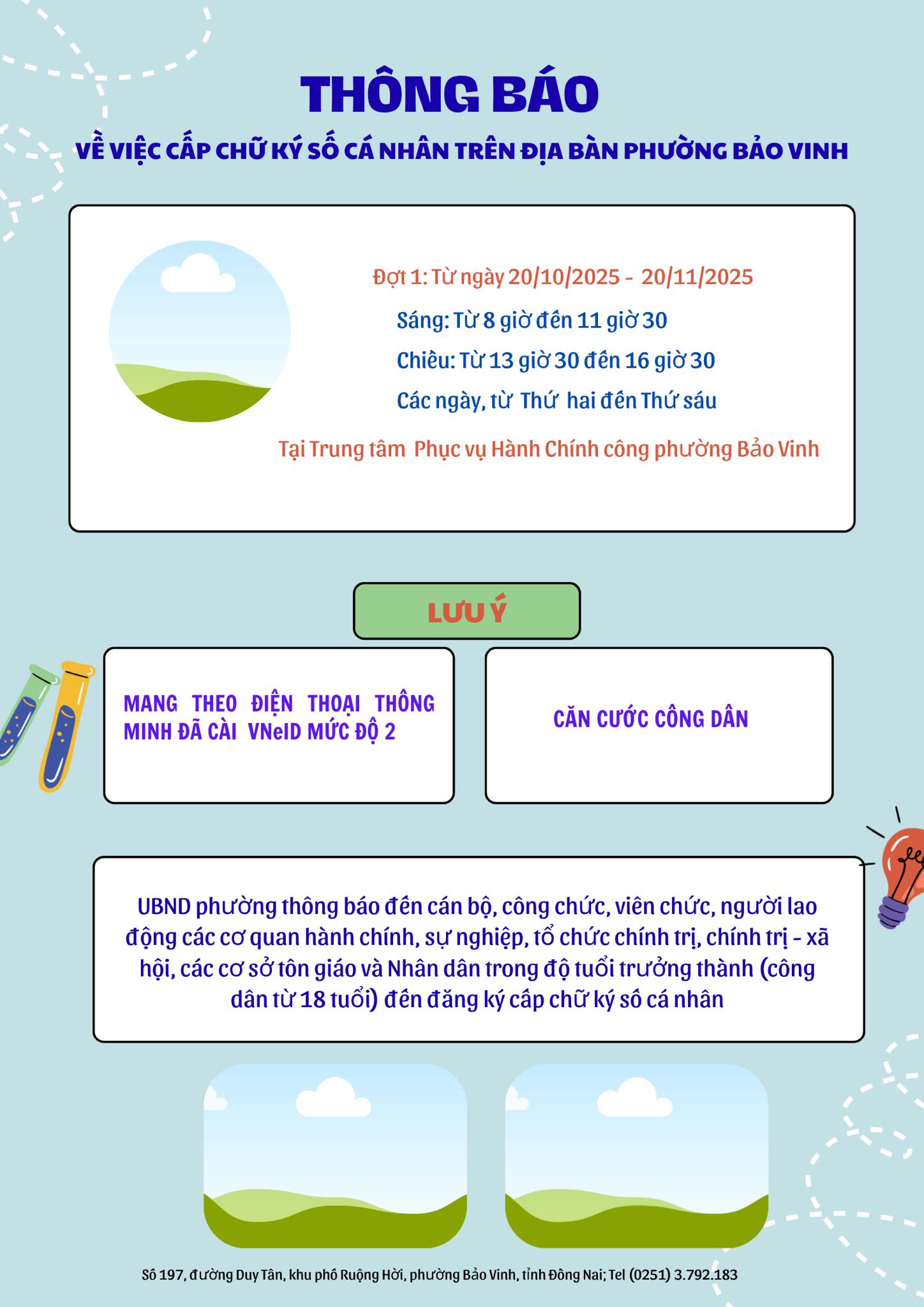 UBND phường thông báo đến cán bộ, công chức, viên chức, người lao động các cơ quan hành chính, sự nghiệp, tổ chức chính trị, chính trị - xã hội, các cơ sở tôn giáo và Nhân dân trong độ tuổi trưởng thành (công dân từ 18 tuổi) đến đăng ký cấp chữ ký số cá nhân.