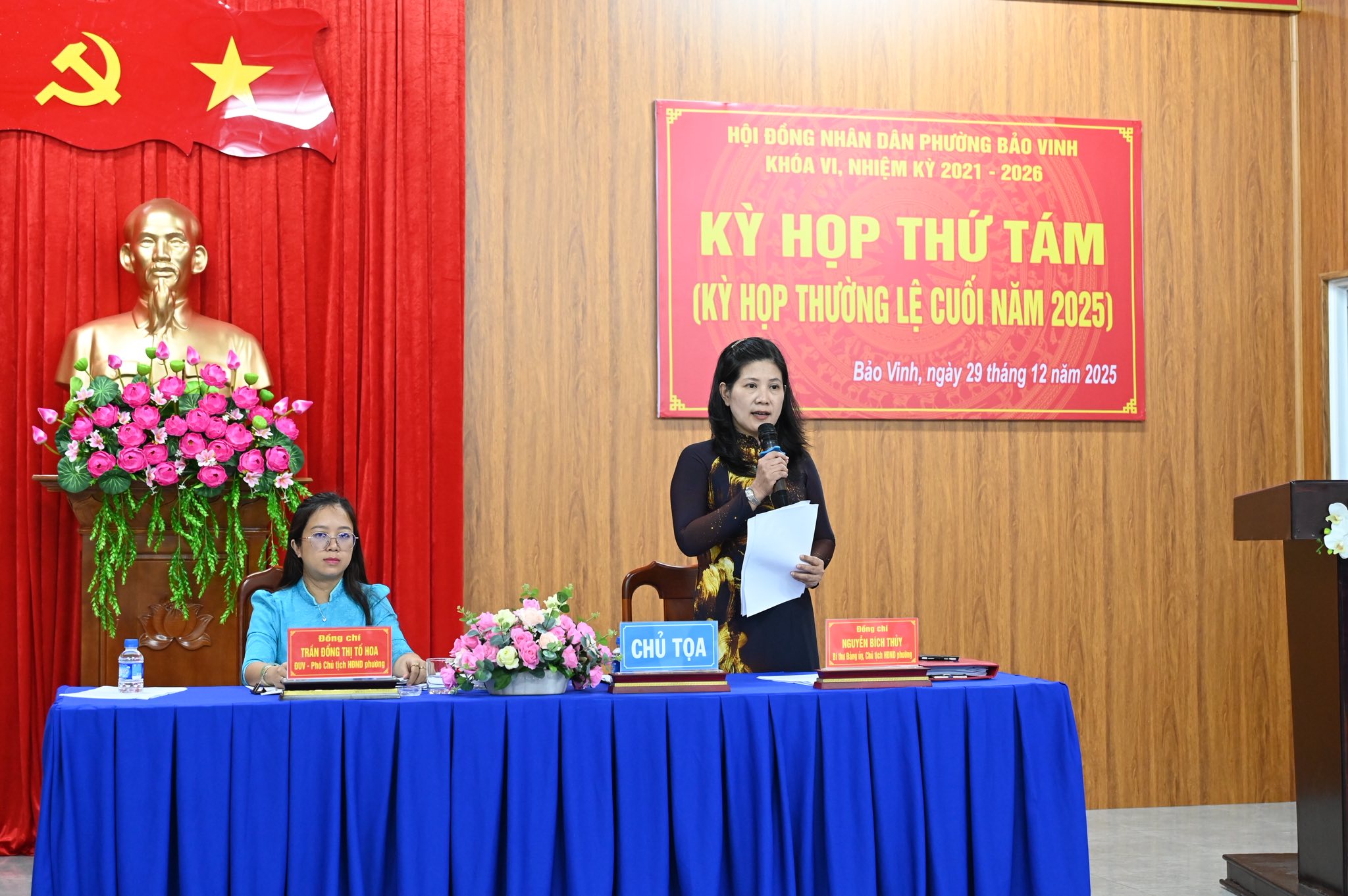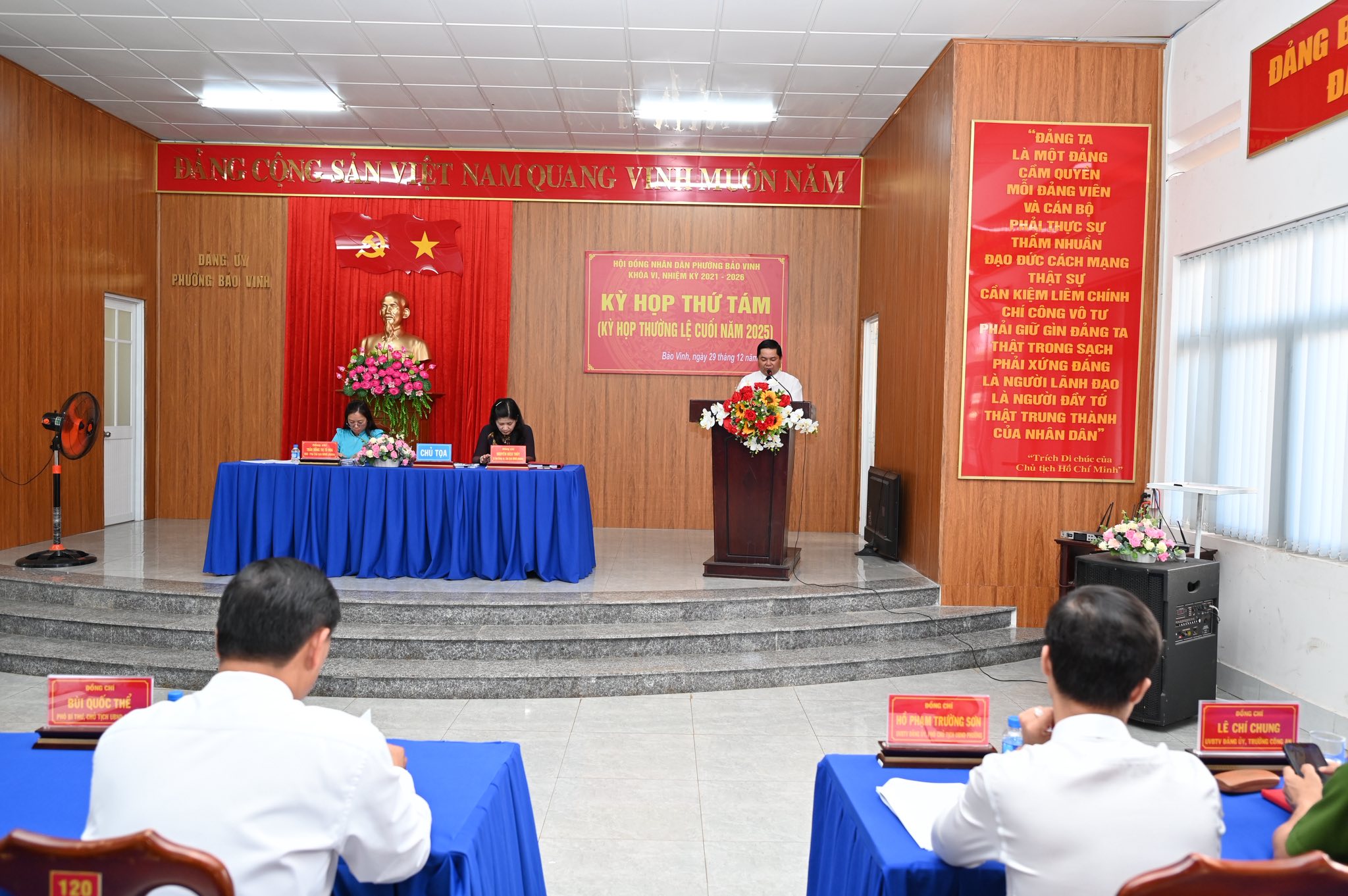 Tại kỳ họp, các đại biểu được nghe lãnh đạo UBND phường thông qua Báo cáo công tác chỉ đạo, điều hành của UBND phường năm 2025, phương hướng nhiệm vụ năm 2026. Báo cáo tình hình phát triển kinh tế - xã hội, quốc phòng - an ninh năm 2025; các mục tiêu, nhiệm vụ, giải pháp chủ yếu năm 2026. Báo cáo thực hiện thu, chi ngân sách năm 2025; phương hướng, nhiệm vụ năm 2026; Kết quả thực hiện công tác đầu tư công năm 2025; phương hướng, nhiệm vụ năm 2026 trên địa bàn phường Bảo Vinh…