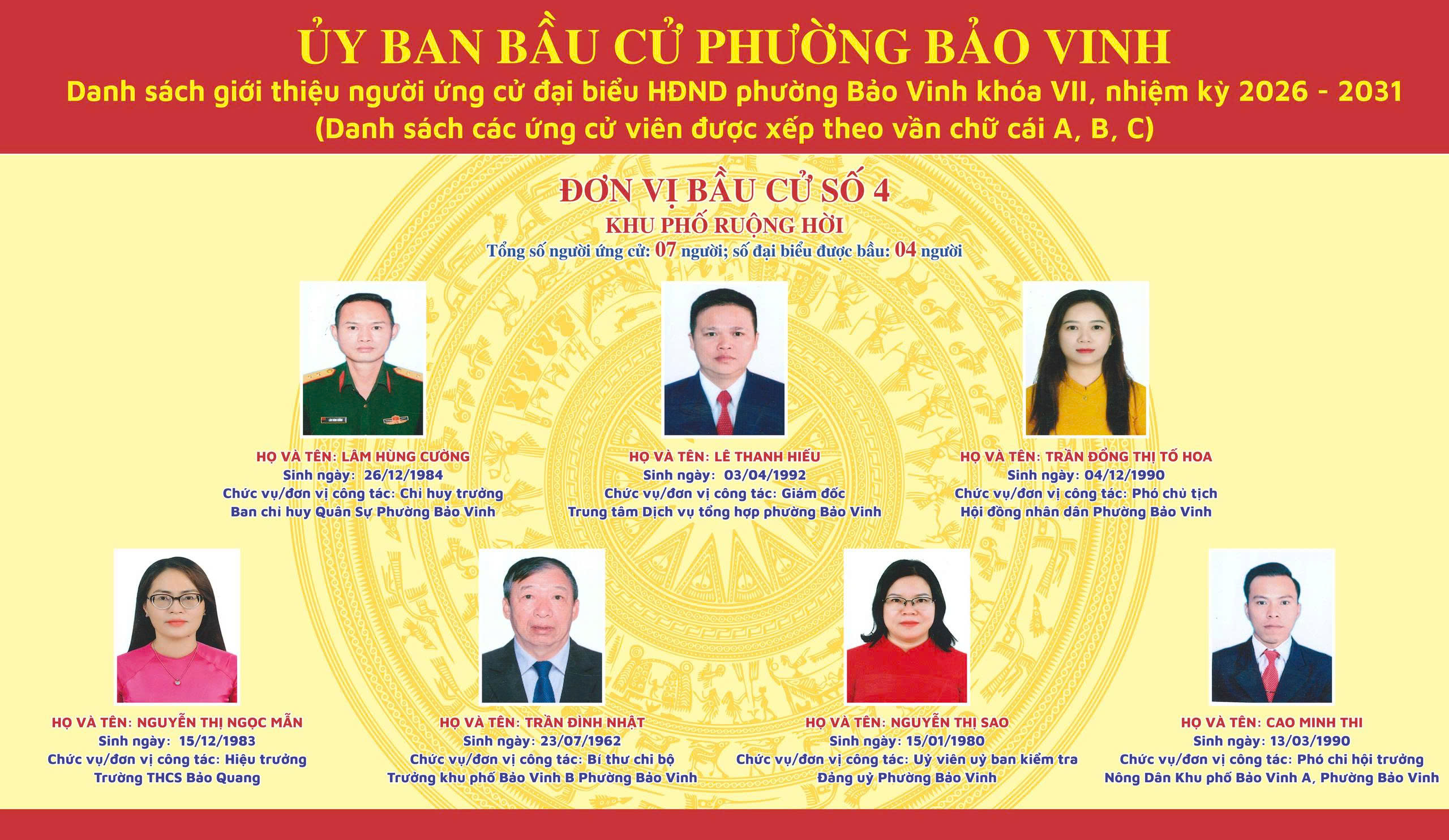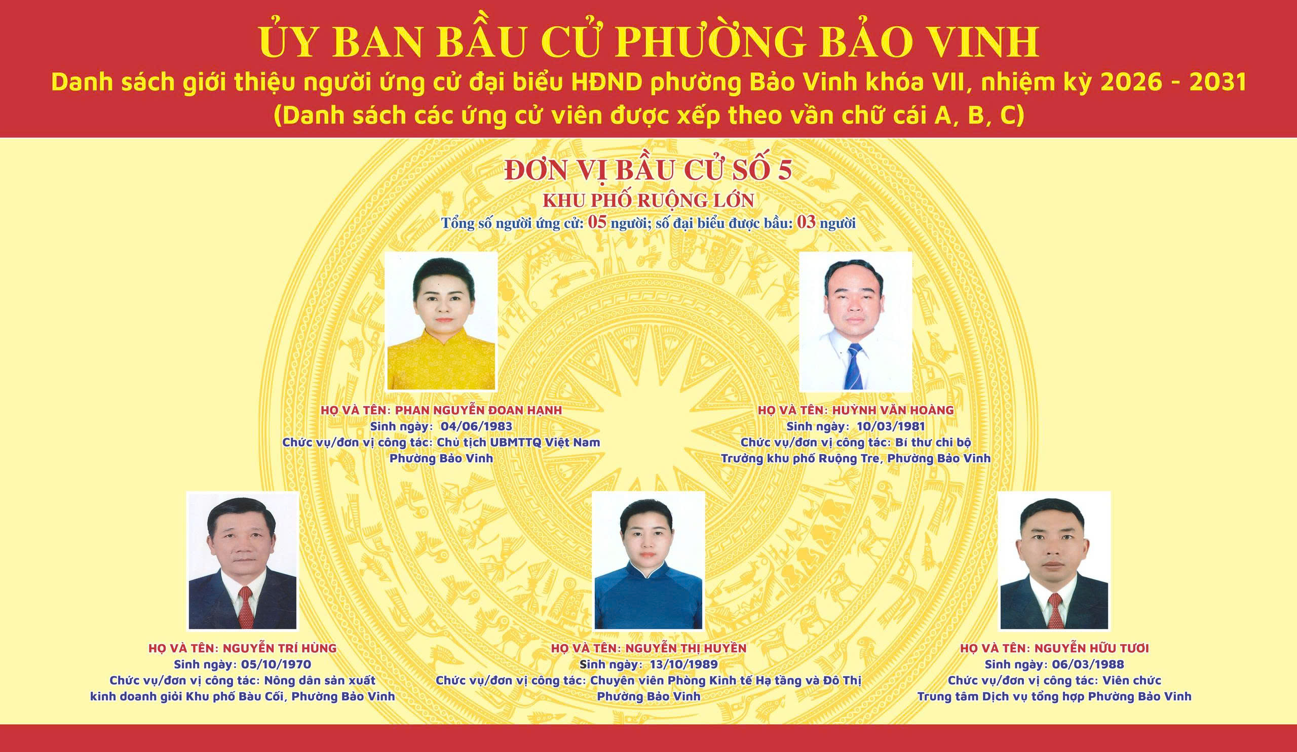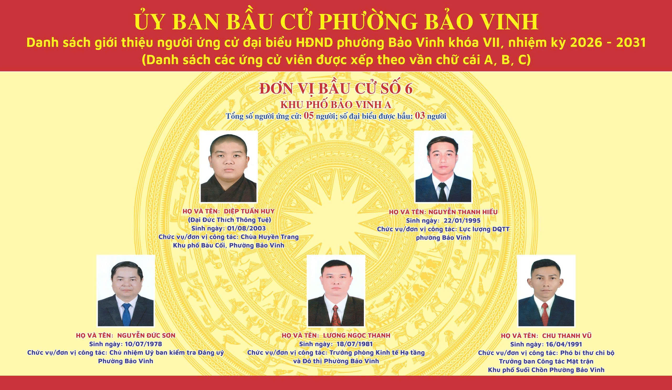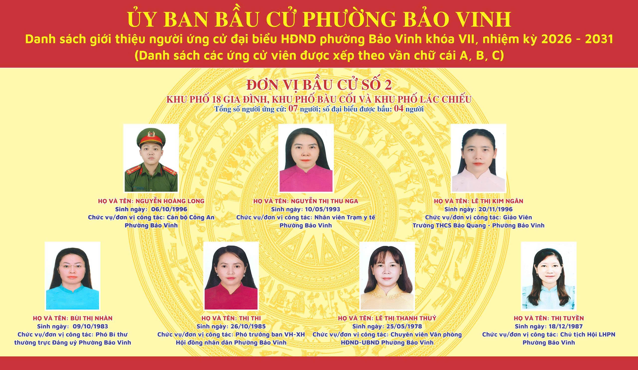 Công bố danh sách giới thiệu người ứng cử đại biểu HĐND phường Bảo Vinh khóa VII, nhiệm kỳ 2026-2031