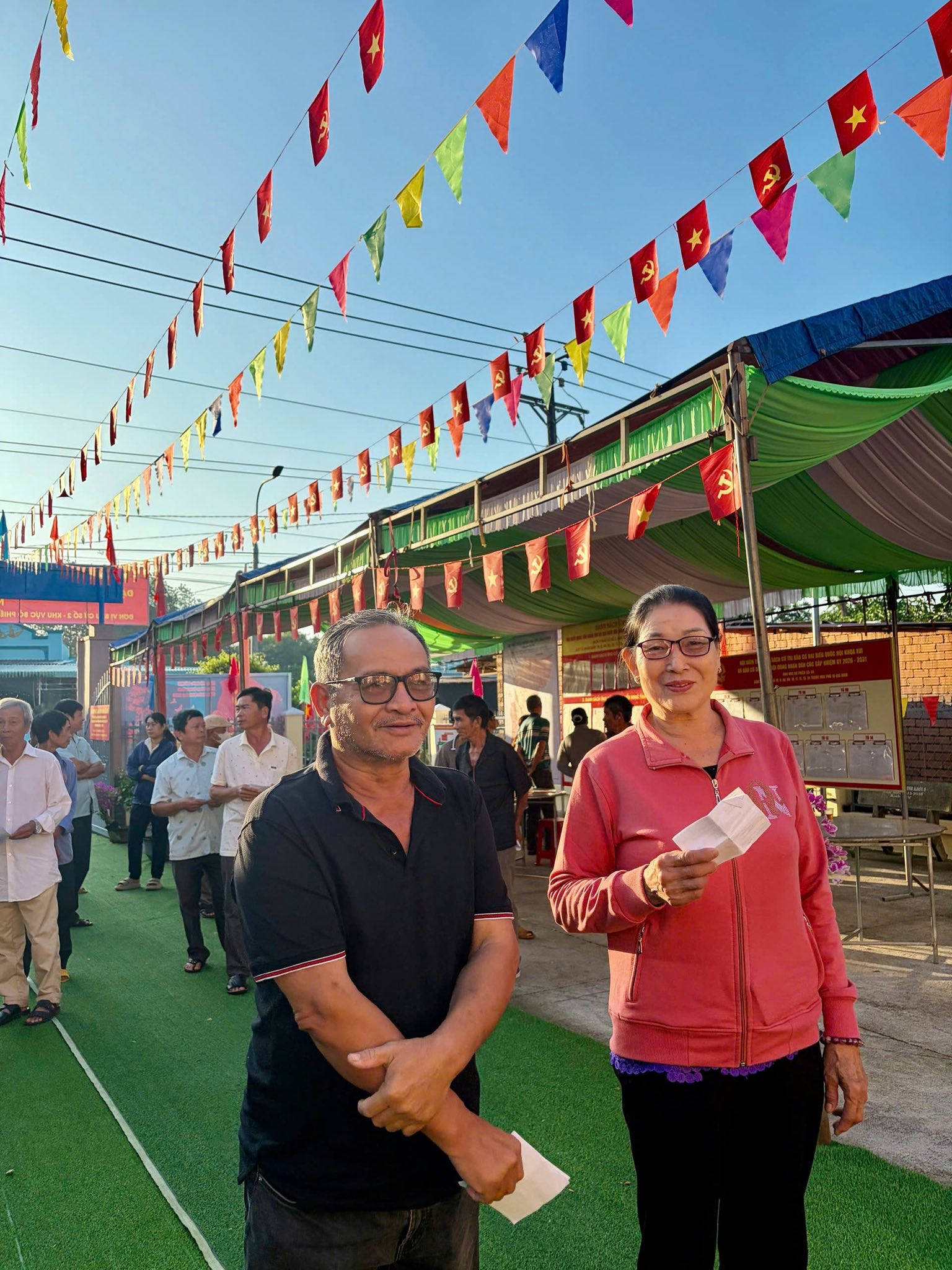 Cử tri Thổ Thị Loan, khu phố Ruộng Lớn có mặt tại khu vực bỏ phiếu số 12 tại Nhà văn hóa Cho-ro từ sáng sớm chia sẻ: hôm nay tôi rất vinh dự và phấn khởi, vui mừng được cầm lá phiếu bầu các vị đại biểu của Quốc hội và HĐND các cấp nhiệm kỳ 2026-2031. Tôi mong các đại biểu dân cử được cử tri bầu ra sẽ quan tâm đến những hoàn cảnh người già neo đơn, học sinh khó khăn, và quan tâm đến đồng bào Cho-ro nhiều hơn”.