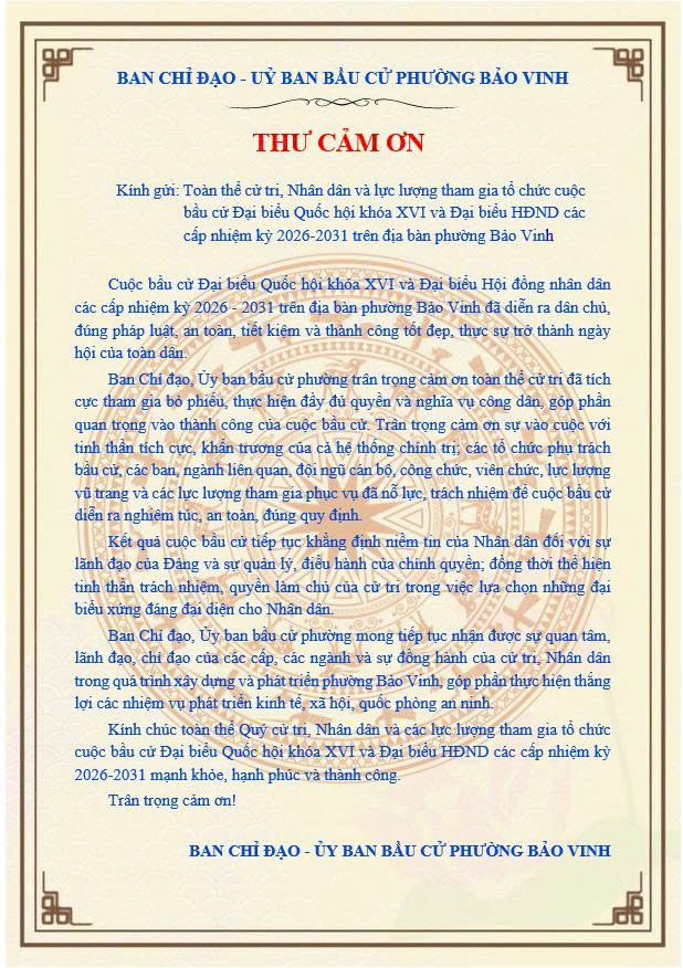THƯ CẢM ƠN CỦA BAN CHỈ ĐẠO - ỦY BAN BẦU CỬ PHƯỜNG BẢO VINH
