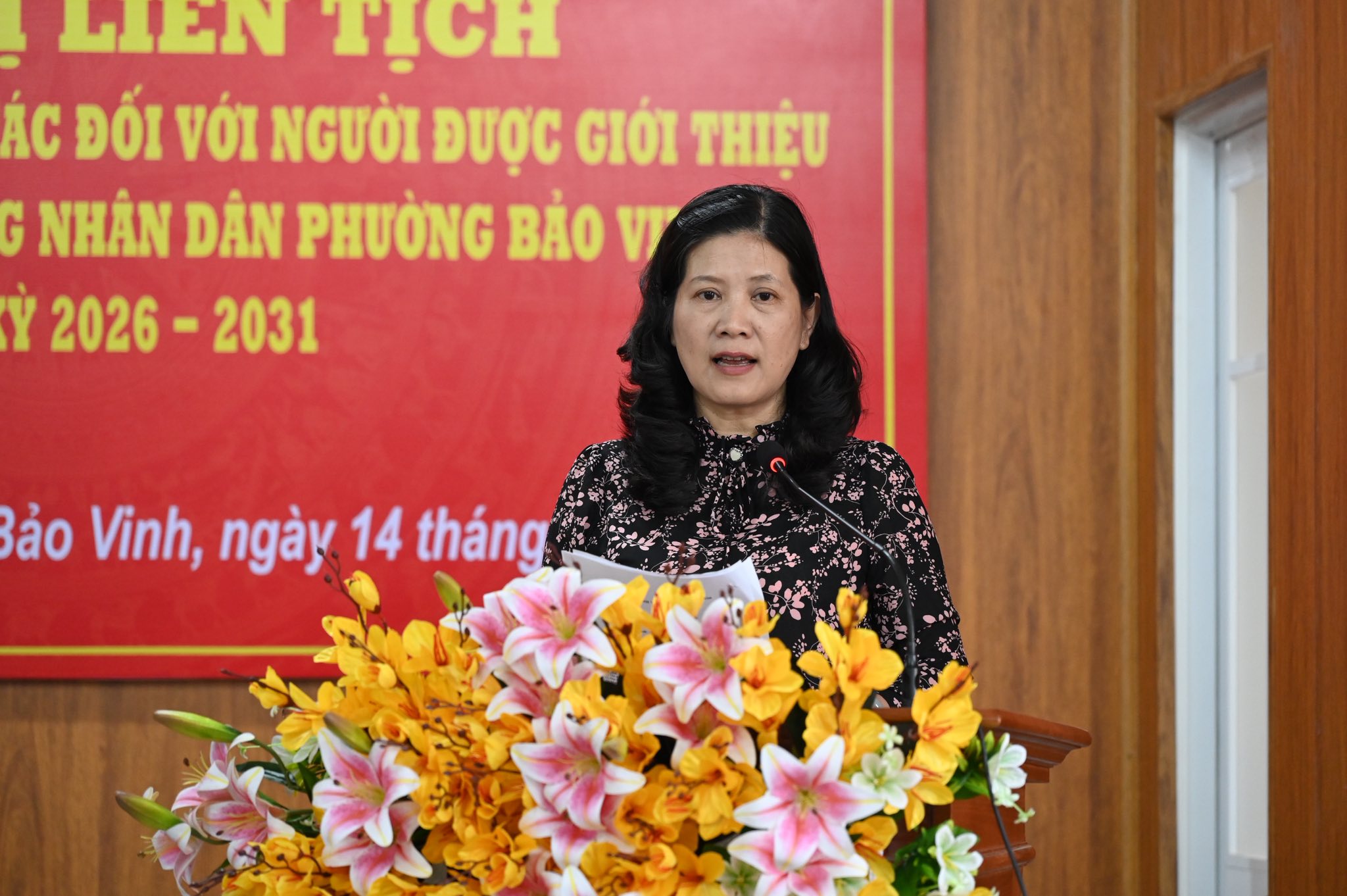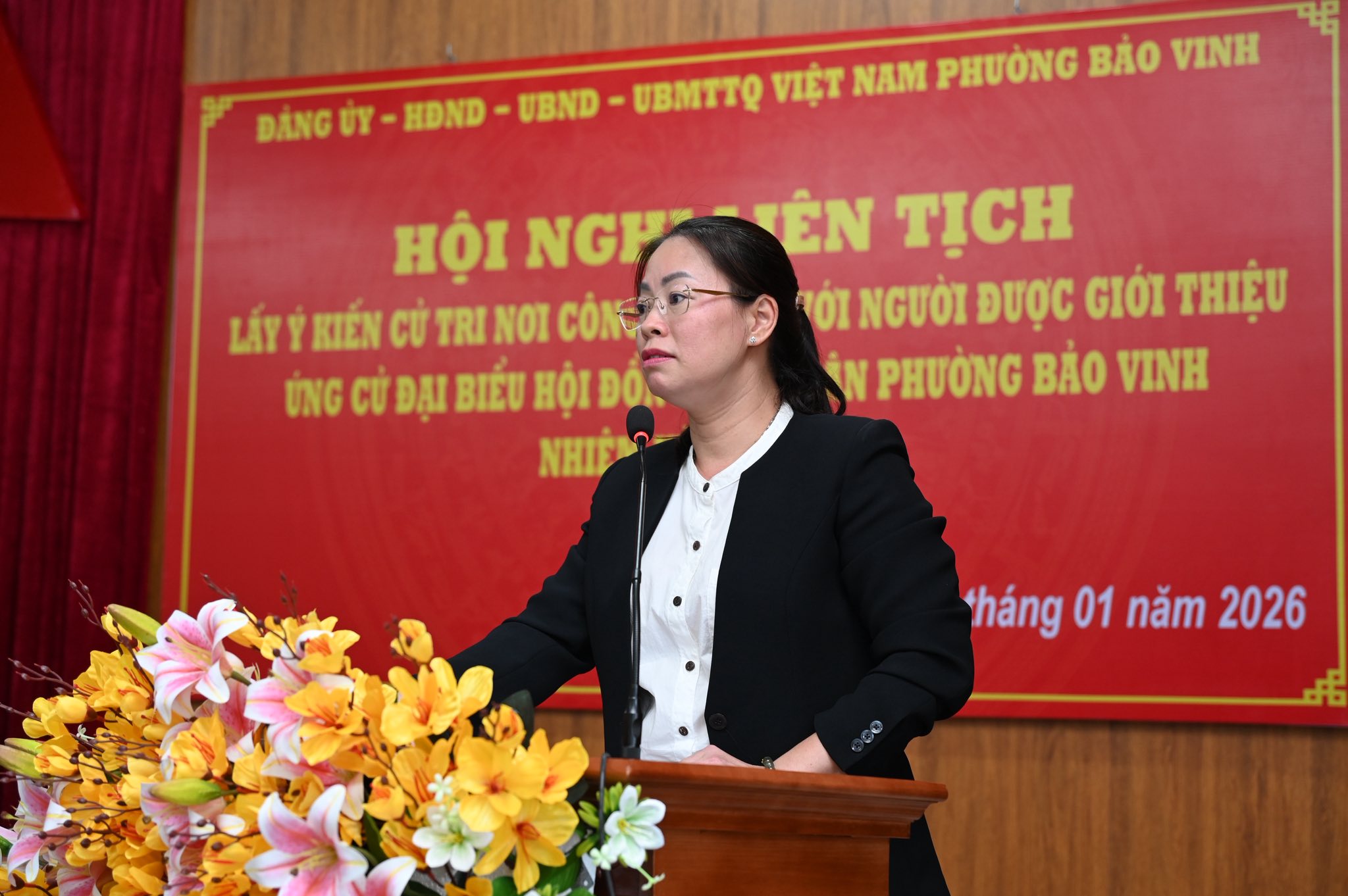 Hội nghị báo cáo số lượng cử tri được mời và số lượng cử tri tham dự; phổ biến tiêu chuẩn đại biểu HĐND, các trường hợp không được ứng cử theo quy định; thông qua danh sách các đại biểu đã được các cơ quan, đơn vị giới thiệu ứng cử đại biểu HĐND phường nhiệm kỳ 2026 – 2031. Theo đó, danh sách dự kiến giới thiệu ứng cử gồm 22 người. Trong đó: Khối Đảng: 6 người; khối HĐND: 3 người; khối UBND: 9 người; khối Mặt trận và các tổ chức chính trị - xã hội: 4 người.