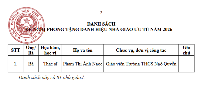 Hội đồng xét tặng danh hiệu Nhà giáo Nhân dân, Nhà giáo ưu tú phường Bảo Vinh tổ chức lấy ý kiến thăm dò dư luận đối với 01 ứng viên đề nghị xét tặng danh hiệu Nhà giáo Nhân dân, Nhà giáo ưu tú năm 2025.