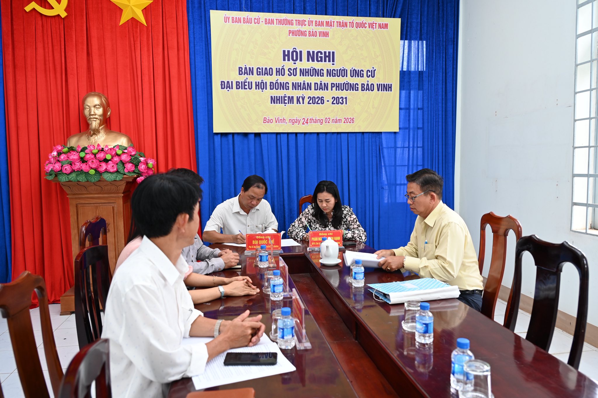 Theo đó, Ban Thường trực Ủy ban Mặt trận Tổ quốc Việt Nam phường bàn giao cho Ủy ban Bầu cử phường các văn bản gồm: Danh sách chính thức những người đủ tiêu chuẩn ứng cử đại biểu Hội đồng nhân dân phường Bảo Vinh, nhiệm kỳ 2026 - 2031 (có xác nhận của Ban Thường trực Ủy ban MTTQ Việt Nam phường, gồm 38 ứng cử viên); Danh sách và 02 đơn xin không ứng cử đại biểu Hội đồng nhân dân phường Bảo Vinh, nhiệm kỳ 2026 - 2031 (có xác nhận của Ban Thường trực Ủy ban MTTQ Việt Nam phường); Tiểu sử tóm tắt theo mẫu số 07/HĐBC-HĐND (40 bản sao); Bản kê khai tài sản, thu nhập của người ứng cử theo mẫu số 09/HĐBC-HĐND (40 bản chính); Biên bản Hội nghị hiệp thương lần thứ ba.