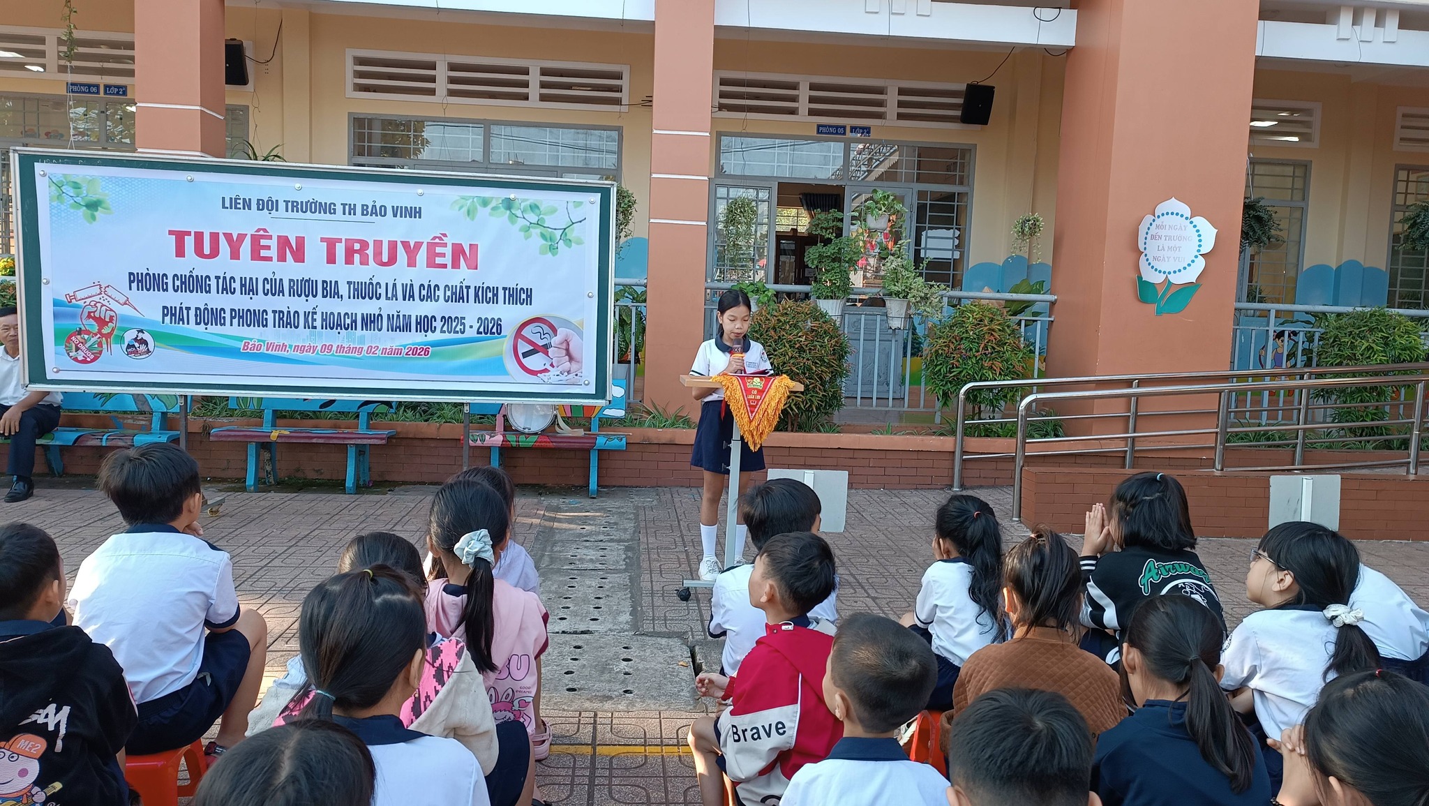 Sáng ngày 09/02/2026, trong giờ chào cờ đầu tuần, Liên đội trường Tiểu học Bảo Vinh đã tổ chức buổi sinh hoạt chuyên đề tuyên truyền về tác hại của rượu, bia, thuốc lá và các chất kích thích. Đồng thời, nhà trường cũng chính thức phát động phong trào “Kế hoạch nhỏ” năm học 2025 - 2026.